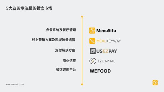 经过十年的不懈探索与持续创新,MenuSifu 已构建起一套完整的、覆盖餐饮全生命周期的服务体系:从前期的餐饮咨询与专业数据分析(Wefood),到运营中的支付解决方案(USezPay),再到线上点餐与私域流量运营(MealKeyway)和餐饮企业经营的资金支持(EZ Capital),全方位满足餐厅在不同发展阶段的各种需求。