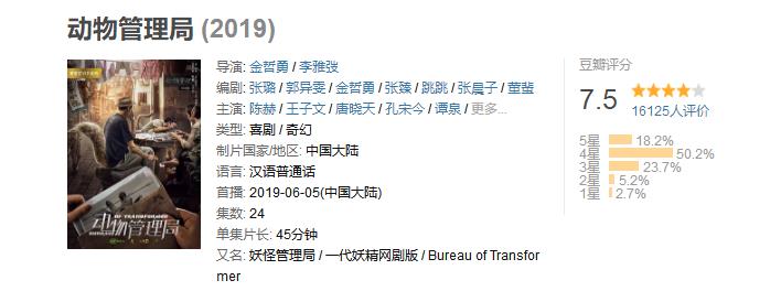 《动物管理局》是由陈赫、王子文、唐晓天、孔宋今、谭泉、黄一琳、黄天元、龙斌等主演的都市减压轻喜剧 。该剧讲述了兽医郝运因为一场猫咪配种事故,意外发现这个世上有转化者的存在,从而进入动物管理局,开启了一个巨大而神秘的都市精灵世界的故事 。豆瓣评分充分说明这是一部被名字耽误的好电视剧。