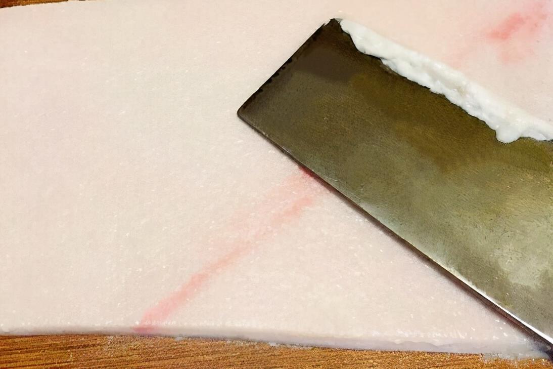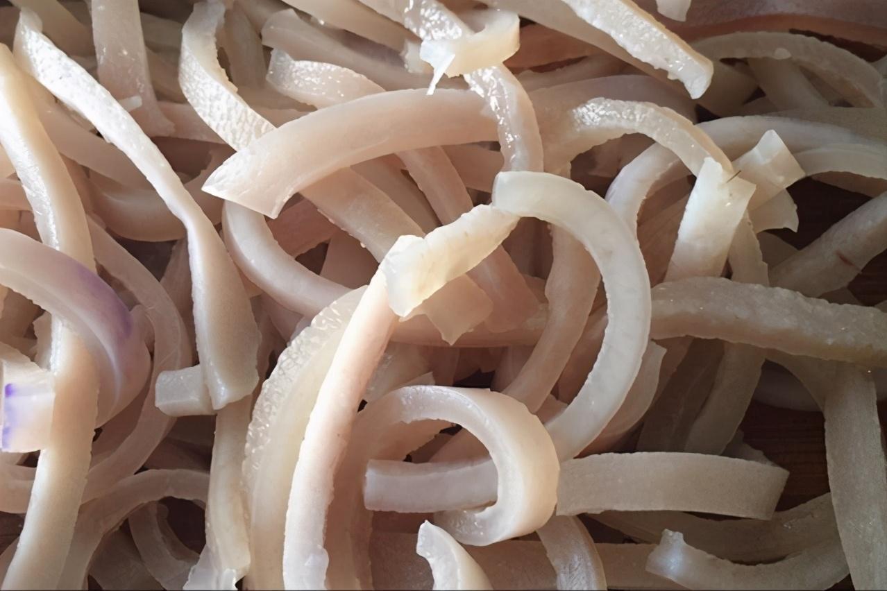 5、再次冲洗几遍,这样的猪皮冻才算干净,成品也会晶莹剔透,没有半点杂质,开始改刀吧。