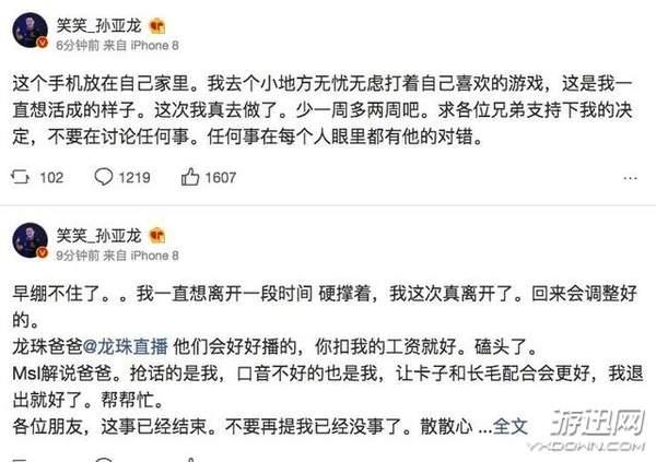 随后笑笑宣布退出此次MSI解说工作,同时打算停播一段时间,整理一下心情
