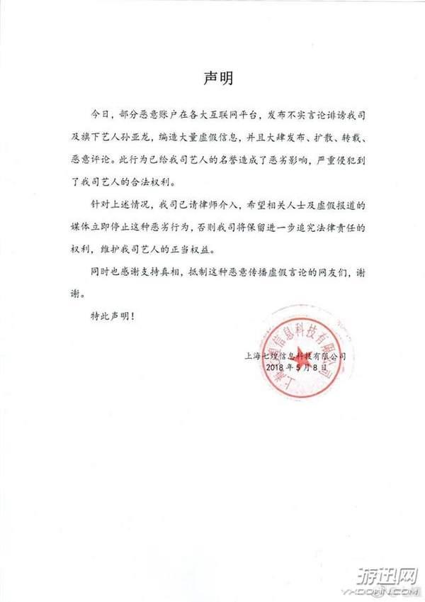 七煌发布严正声明,对于恶意中伤孙亚龙的某些人提出警告,否则将采用法律手段维权