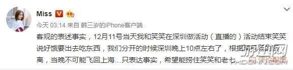 Miss声援笑笑,表示所谓的探险那天她和笑笑在深圳做活动,按照当时那个时间点,他根本没有时间飞回上海