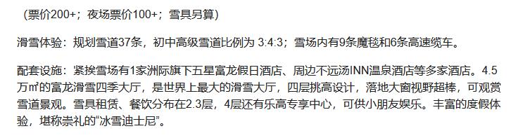 富龙四季小镇是以家庭、儿童为主要特色的大型休闲滑雪度假区,开放夜场,有初级教学区、儿童全时托管乐园以及戏雪乐园等初级区域和娱雪休闲区域,非常适合带小朋友前来体验。但是目前雪道较少,长度一般。