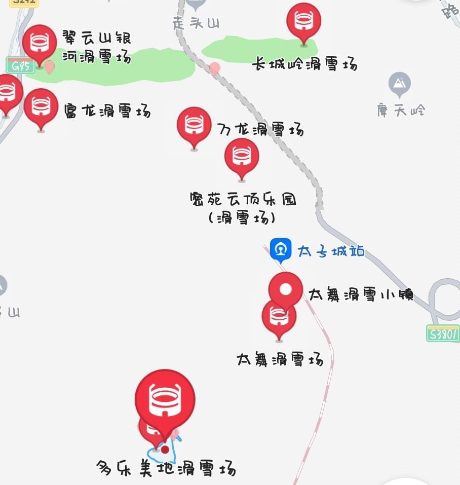 长城岭滑雪场被征用暂时不对外开放了,多乐美地滑雪场是个麻雀虽小五脏俱全的滑雪场,雪场90%的雪道都是由人工造雪机铺设而成的,驿馆在这也不多做介绍。