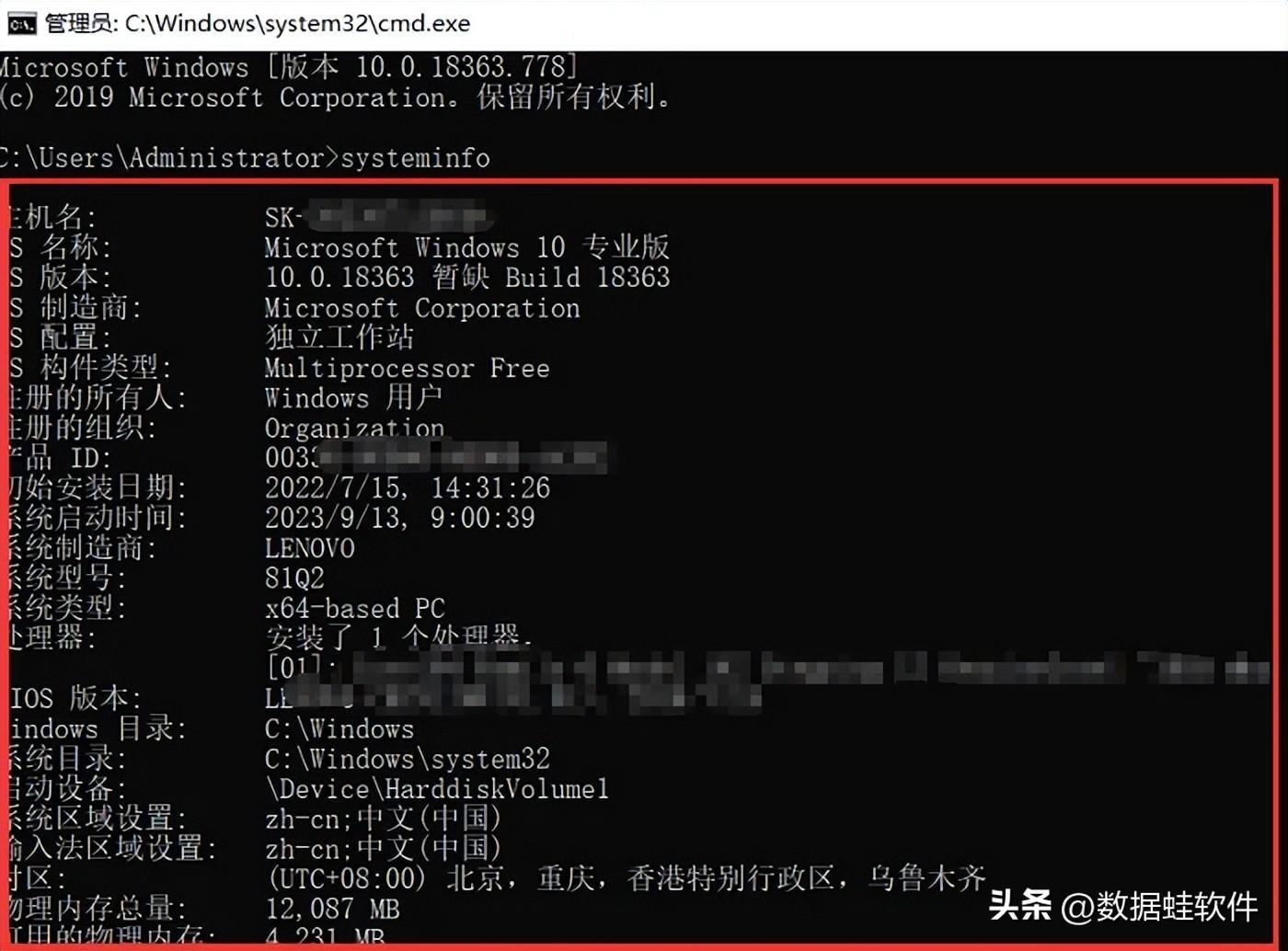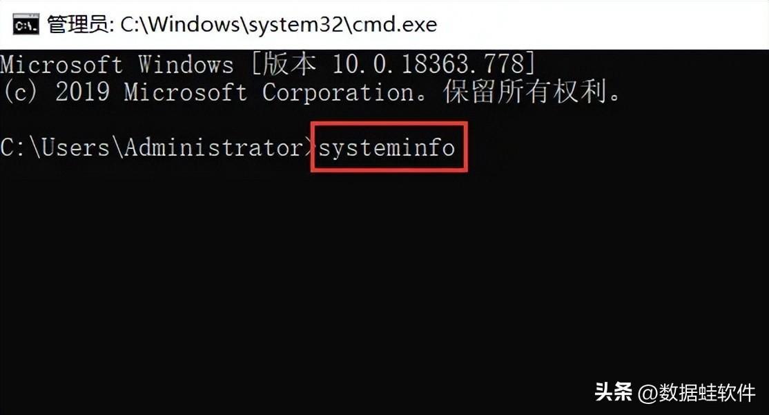 步骤2:在打开的管理员窗口输入命令【systeminfo】,并按【Enter】键。