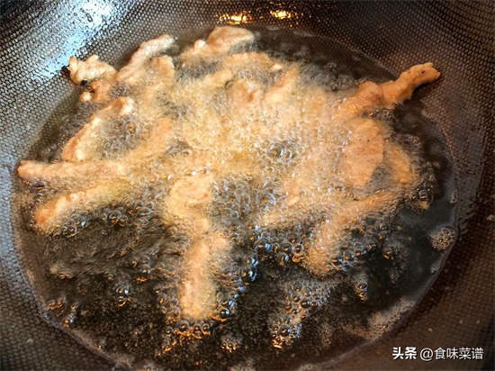 3、起锅烧油,油温六成热的时候,下入里脊肉条开炸,用中小火慢炸,炸至里脊变色,控油捞出,第二次升高油温,重新下入油锅,中火炸20秒钟,炸至色泽金黄,控油捞出,炸两次口感明显更酥脆。