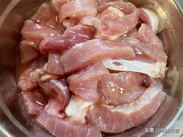 1、准备一斤里脊肉,里脊肉是猪牛羊脊椎骨内侧的条状嫩肉,味道鲜美,口感很嫩,里脊肉最适合做小酥肉、里脊肉丝等菜肴,先把里脊肉切条,加少许的食盐、料酒、白胡椒粉,腌制20分钟,去腥入味。