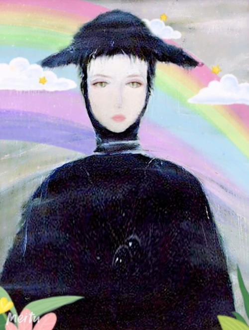 3. 绘画手法——采用超级主观的表现手法;眼皮处颜料较厚,在光线中投下阴影,女人像睁开了眼睛一样;帽子下方的流淌效果,像雨又像泪。