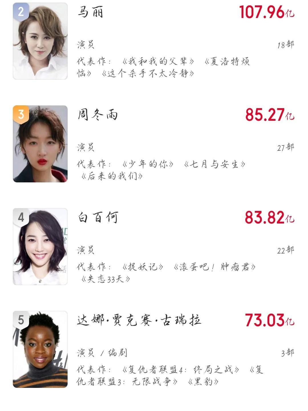 马丽下面就是周冬雨了,这一点也不奇怪,毕竟周冬雨年纪轻轻就拿了影后,演技也都有目共睹。