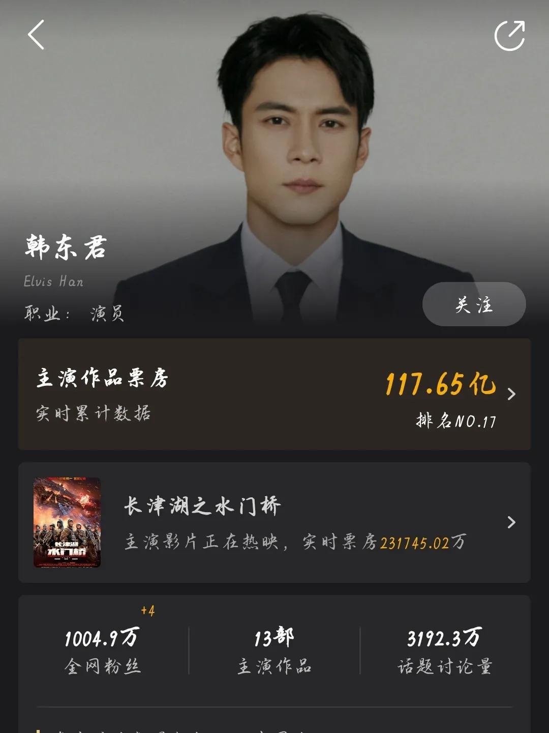 其次毕竟惊讶的就是韩东君,当然还是大都靠《长津湖》呀,两部估计都能破百亿了。