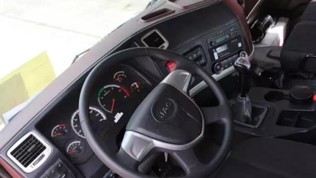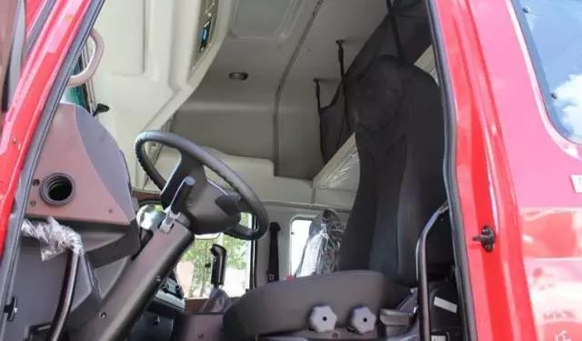 驾驶室内饰采用灰色系加深棕色点缀,配色避免单调。底盘采用少片簧、多片簧悬架同时匹配设计,车身四点悬浮空气气囊悬置,有效衰减行驶中车辆振动和冲击。主座椅标配了多方向可调节的空气弹簧座椅,提高了驾驶员长途驾驶的舒适性。