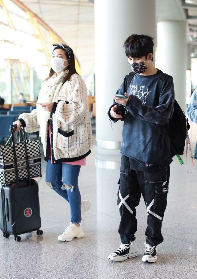 但就服装款式和配色等方面来说,造型整体还是比以前保守了很多,基础款笑脸T恤带着几分玩世不恭的少年感,而紫色格纹工装裤则选择摩登的色彩强调时尚效果,黄紫大胆撞色,倒是颇有几分明星潮范的效果,看来妻子刘迎还是非常注重老公的明星形象,对比来看,她自己的造型却更朴素。