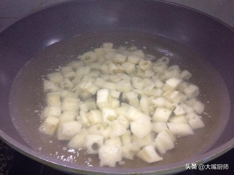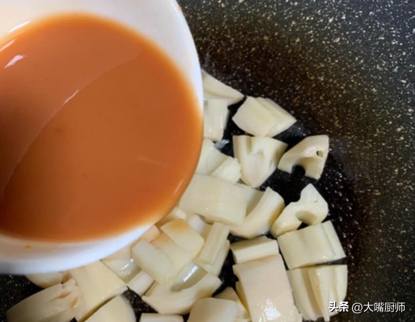 2、碗里加入1勺料酒、2勺生抽、3勺白糖、4勺番茄酱、5勺清水,搅拌均匀备用。起锅烧油,倒入藕丁大火翻炒1分钟,一定要大火炒,才不会出水。