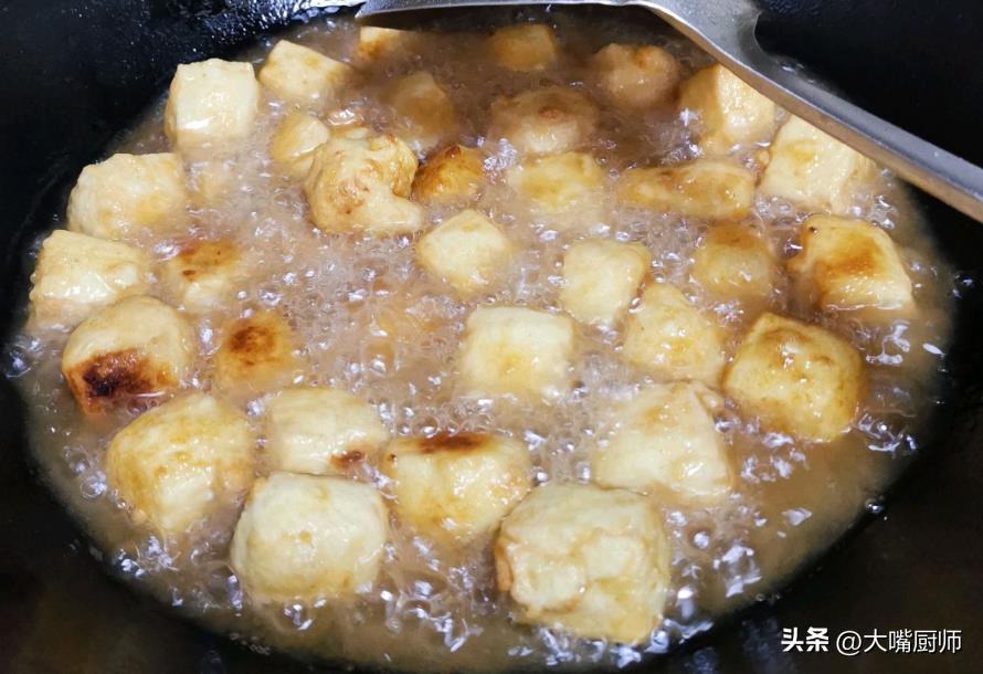 3、锅里留底油,烧热后倒入调好的糖醋汁,小火煮至粘稠,颜色红亮后倒入炸好的豆腐,快速翻炒均匀,裹上一层酱汁后撒上葱花,即可出锅。