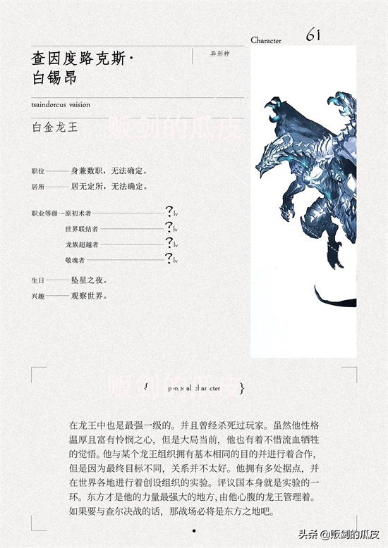 Hello,大家好。我还是那个正经的动漫兼职游戏小编。在前面为数众多的人物基本介绍完毕的现在,终于进行到了重头戏,白金龙王查因度路克斯·白锡昂的人物设定介绍。在这之前,我还是卖一个关子,白金龙王的介绍会放在文章的末尾,各位想要直接观看的可以直接跳转至文章末尾进行观看。