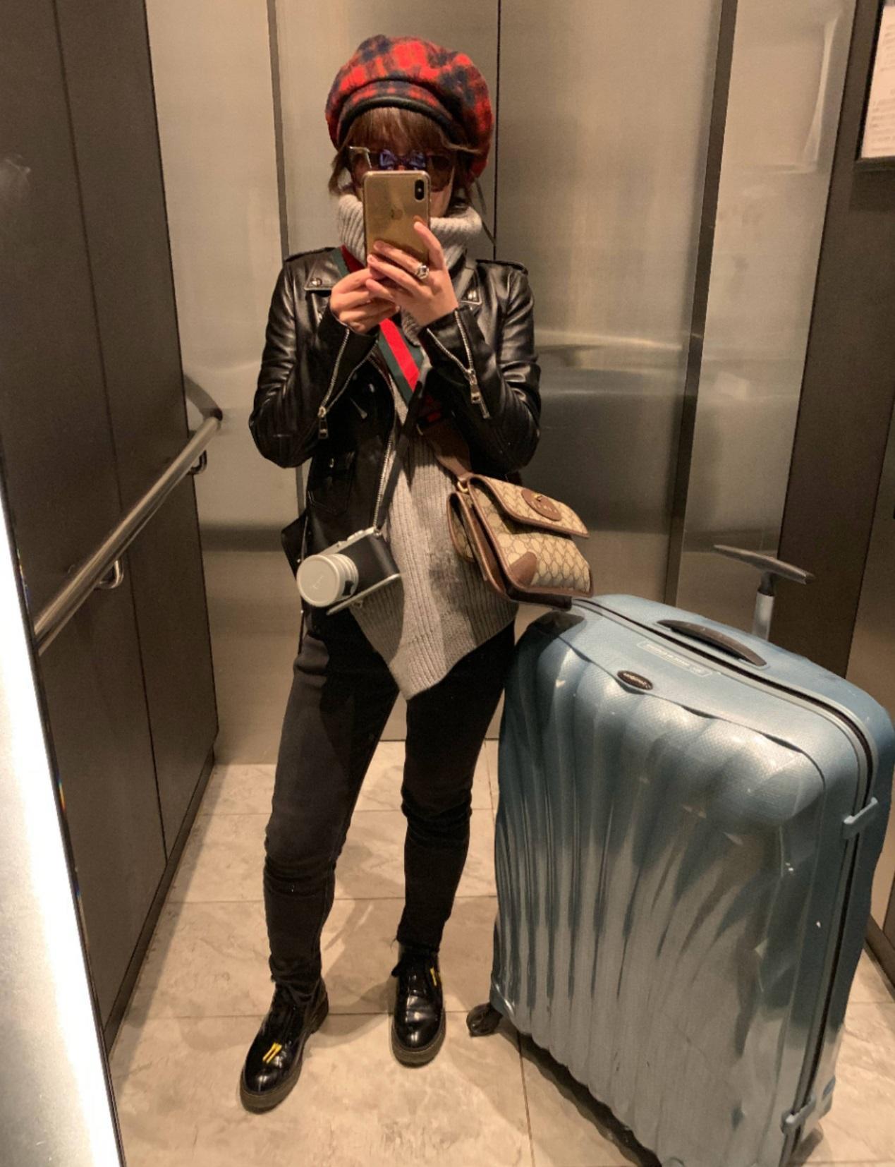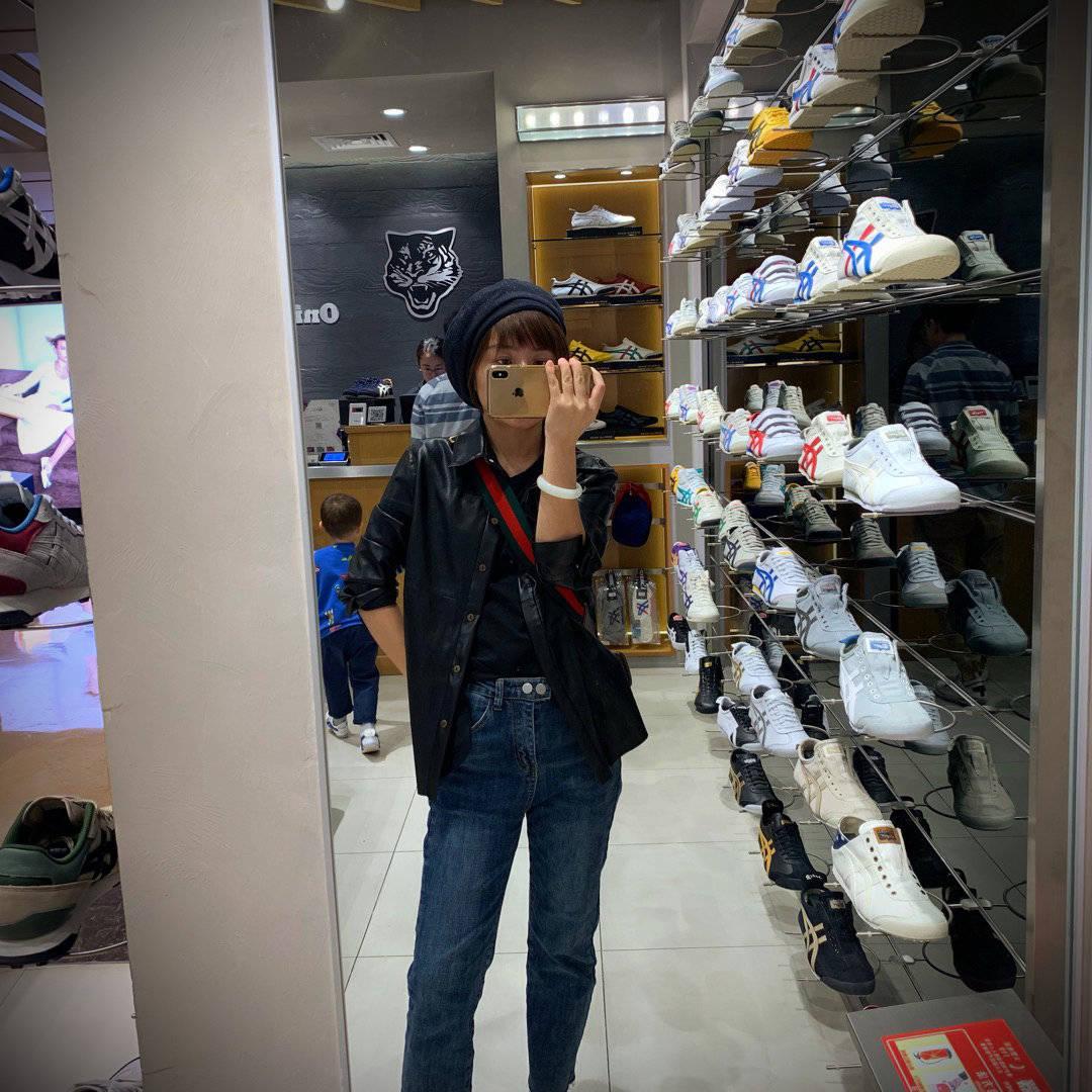 版型挺阔的皮夹克不是很修身的设计,松松垮垮的挂在身上自带一种纸片人的效果。下半身是一条宝蓝色的牛仔裤,九分裤的设计给双腿留有一定的余地,这种穿法也是比较聪明的。其实只要身材苗条的人一般都会显得高挑一些,戴着贝雷帽凹造型的思文看起来一点也不像一米五。