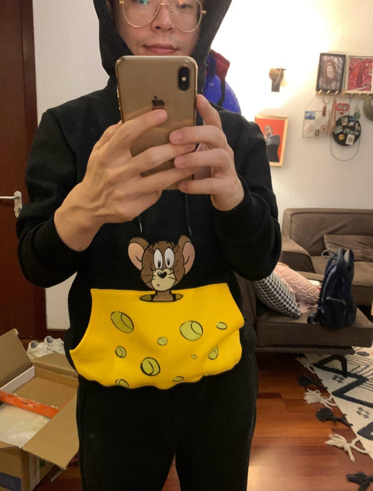 脱口秀演员都是有趣的灵魂,思文的老公程璐就经常在社交平台上和粉丝朋友们分享一下他最近get的奇奇怪怪的小玩意。这件黑色的卫衣上面明黄色的卡通图案相当亮眼,给人一种小老鼠从程璐的口袋里探出脑袋的错觉,看起来既可爱又搞笑。