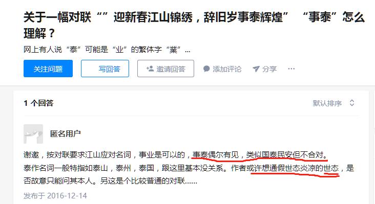 本该忘却的事,但是春节被困在家里,不能探亲也没有亲来,孩子们守着电视抗肺炎,我和妻各种抱着手机浏览,于是上网搜索了这个“事泰”,发现这个词并非始于今年,输入“辞旧岁事泰辉煌”,仅在某度搜索首页即可检索到,时间追溯到2015年。