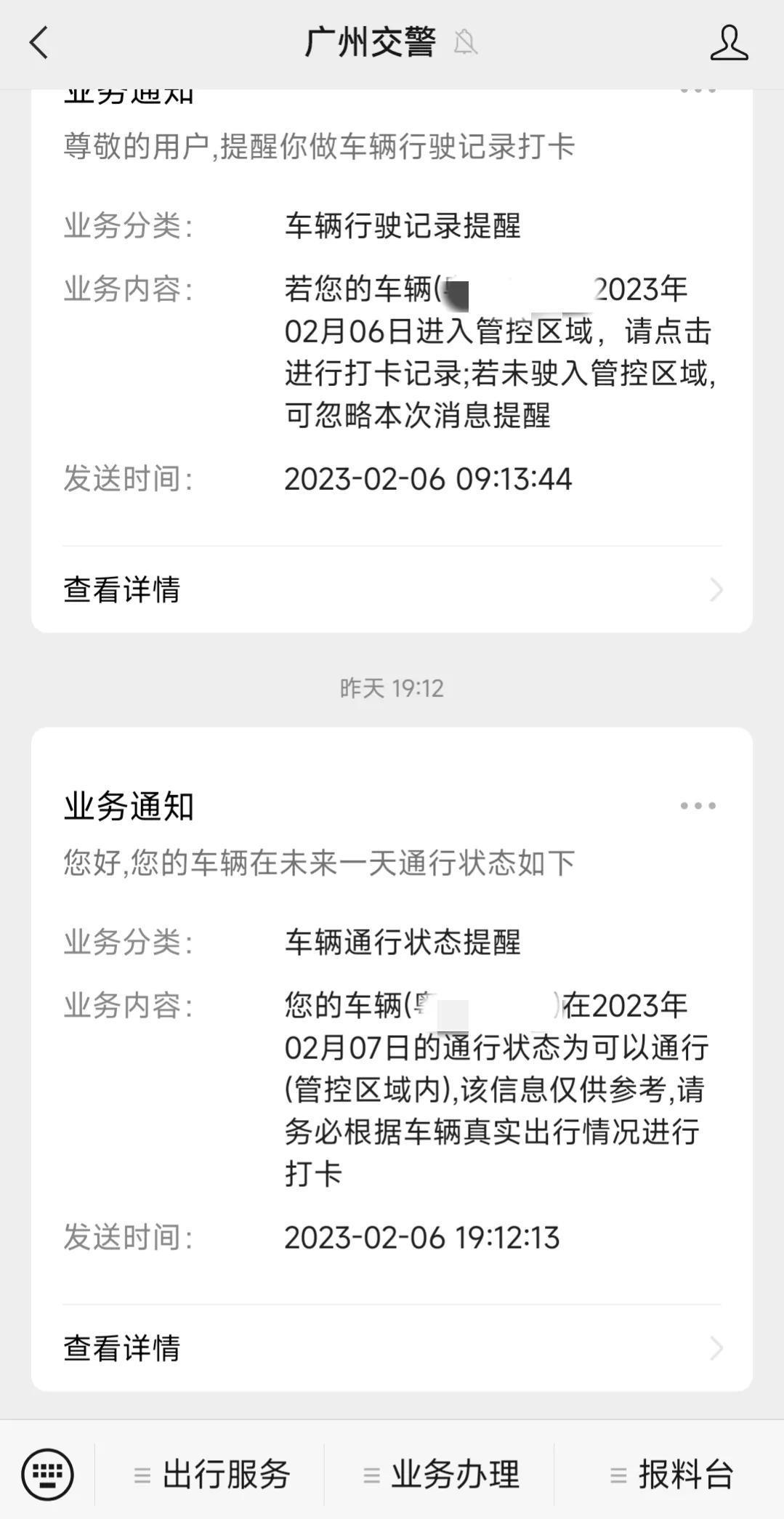 对此,广州还特别开发出了一款工具提供给有这样经常往来的司机,并且通过公众号方式每天提醒注意,这真的“很广州”啊!我是有一段时间经常来回中山和广州,于是也深度使用了这个工具,一开始还比较用心记录,后来就逐渐放弃了,实在没有习惯记下来。后来我直接就安排固定时间开车进入广州,安排的是周一到周三开车,周四到周五打车,这样子变成了开三停四,绝对不会出问题。