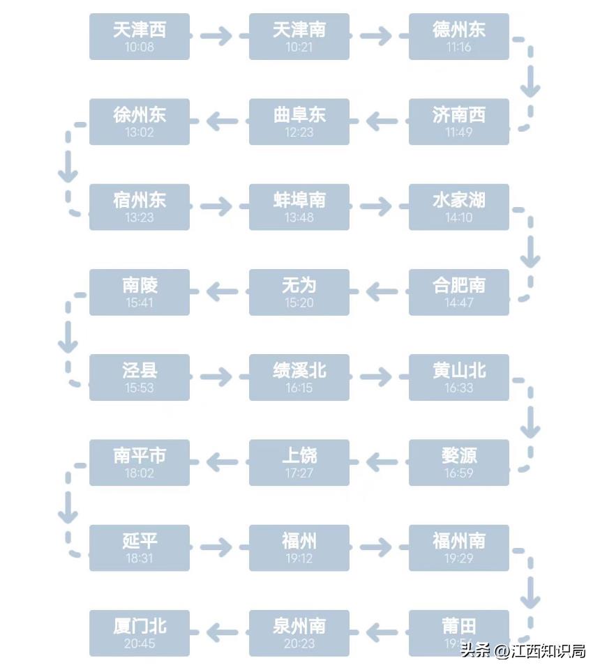 列车途经省份:天津市、河北省、山东省、江苏省、安徽省、江西省、福建省等6省1市。