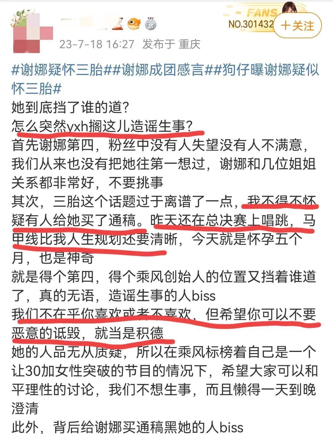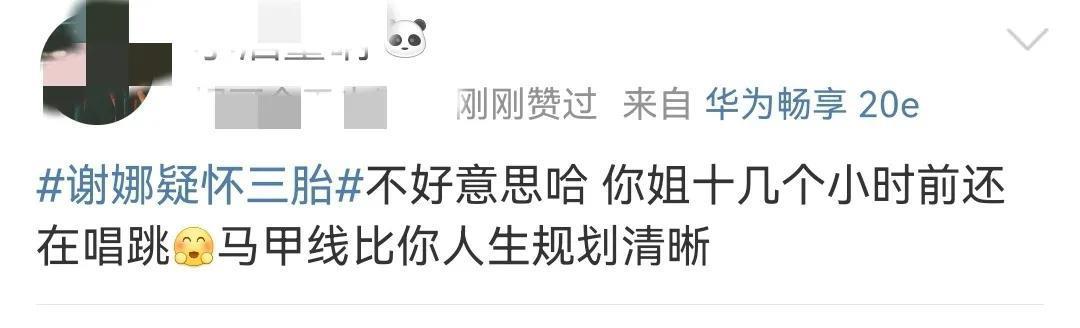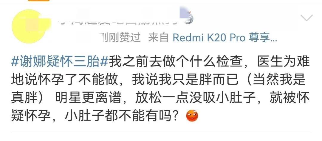 有个女粉丝还以自己发胖去检查被医生当成是孕妇为例,解释了谢娜可能只是放松没吸肚子所以显肚子被当成是怀孕了。