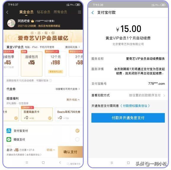 然后选择15元连续包月(8块钱的也是只付1元,如果是3元,先用微信支付买1个月,再支付宝1元开通一个月,更划算),下面选择支付宝支付,确认支付。然后,到右图界面,点击查看扣款方式,一定要点进去,设置工行卡放在扣款顺序第一位