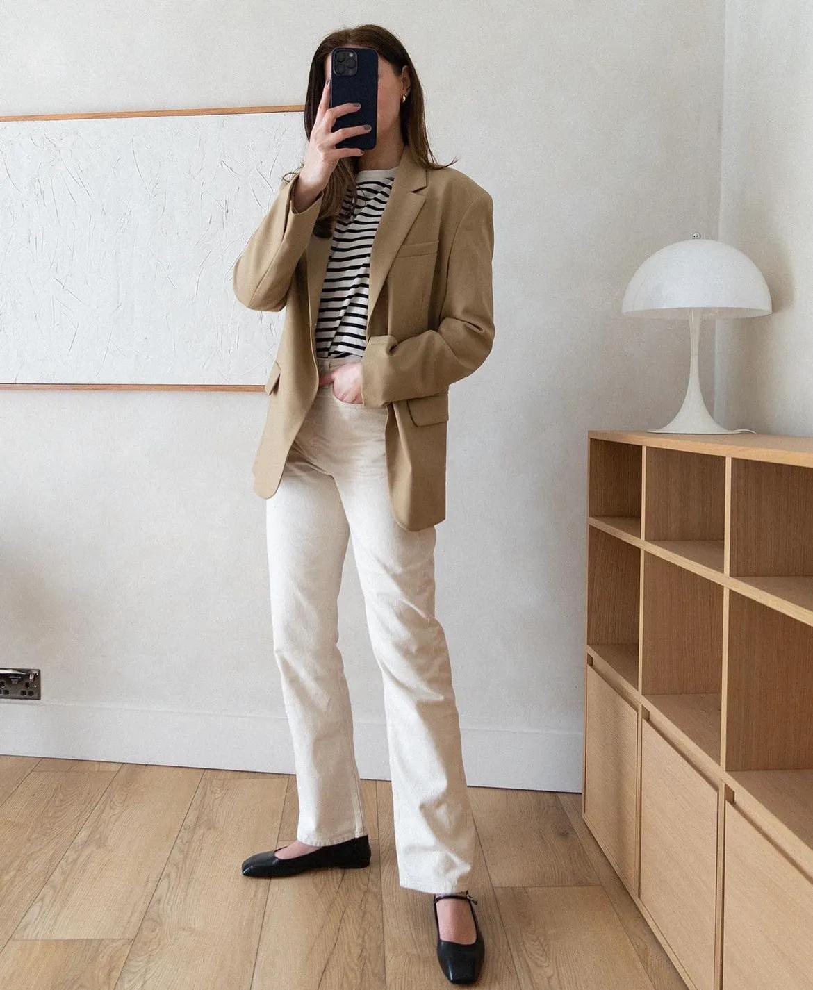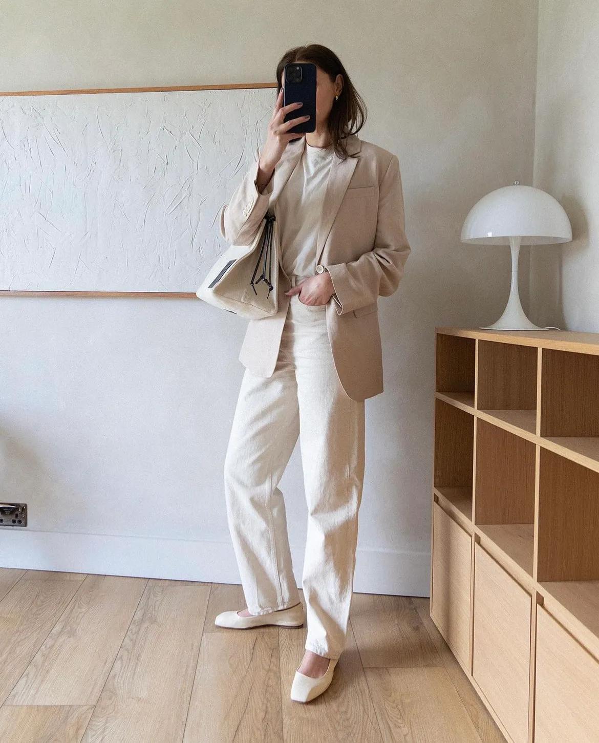 浅米色西装真的很温柔,与白色裤子搭配出迷人味道。即使是冷色调也能穿出有亲和力的感觉。