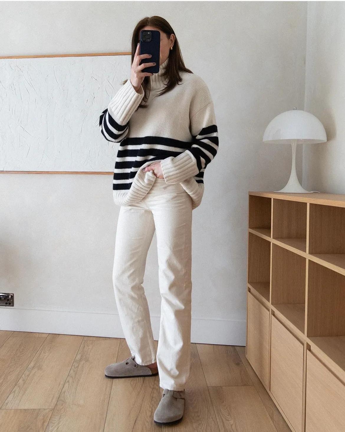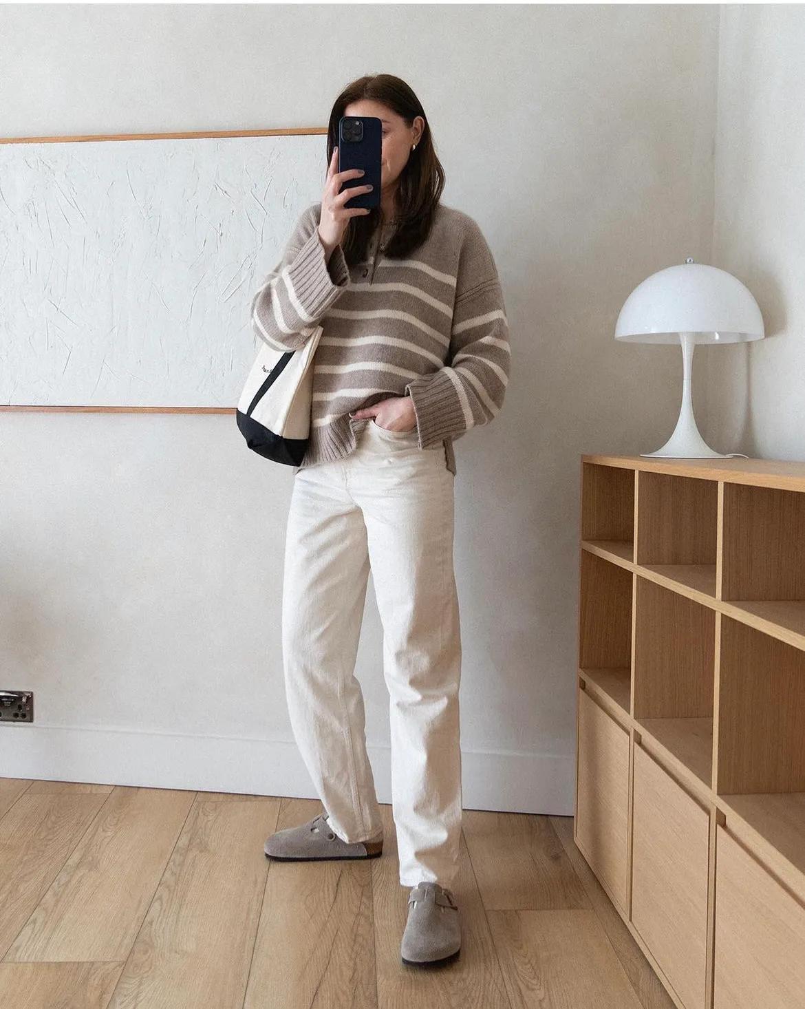 条纹衫绝对是今年我力推的款式,只是换一下颜色,就能与白色长裤穿出很高级自然的风格,可以说是很实用的搭配了。