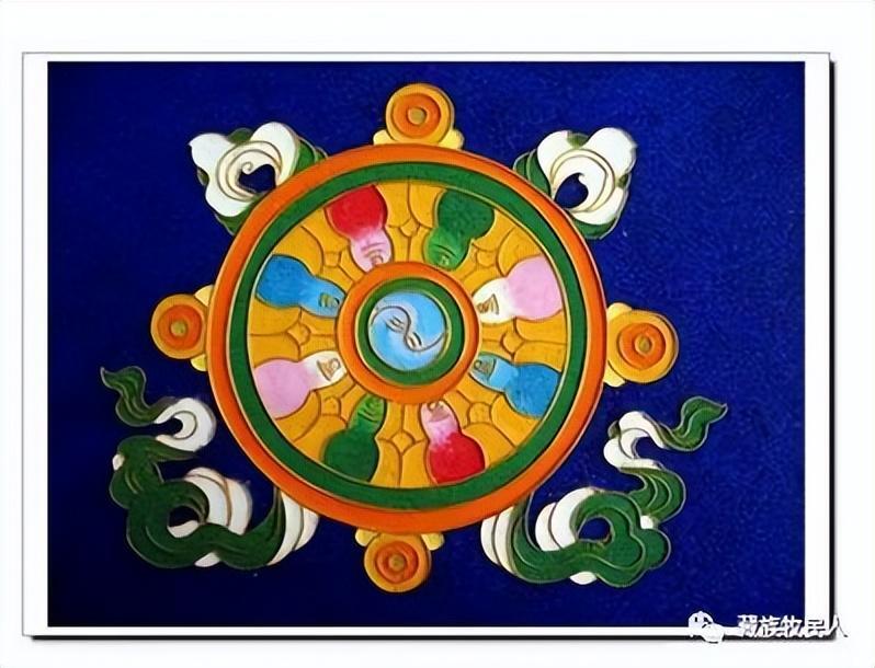 7.金轮:藏语称"阔罗",又名法-轮。藏传佛教认为,它象征着佛陀教义的传播,也代表陀之足;表示佛法圆轮,代代相续,是生命不息的象征。