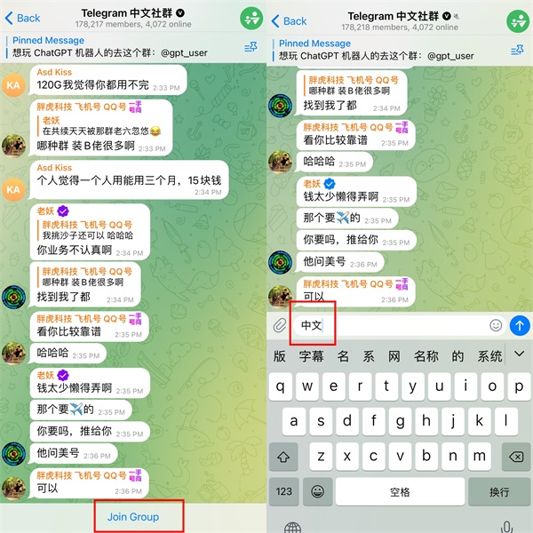 进入群组后点击“Jion Group”并输入“中文”发送