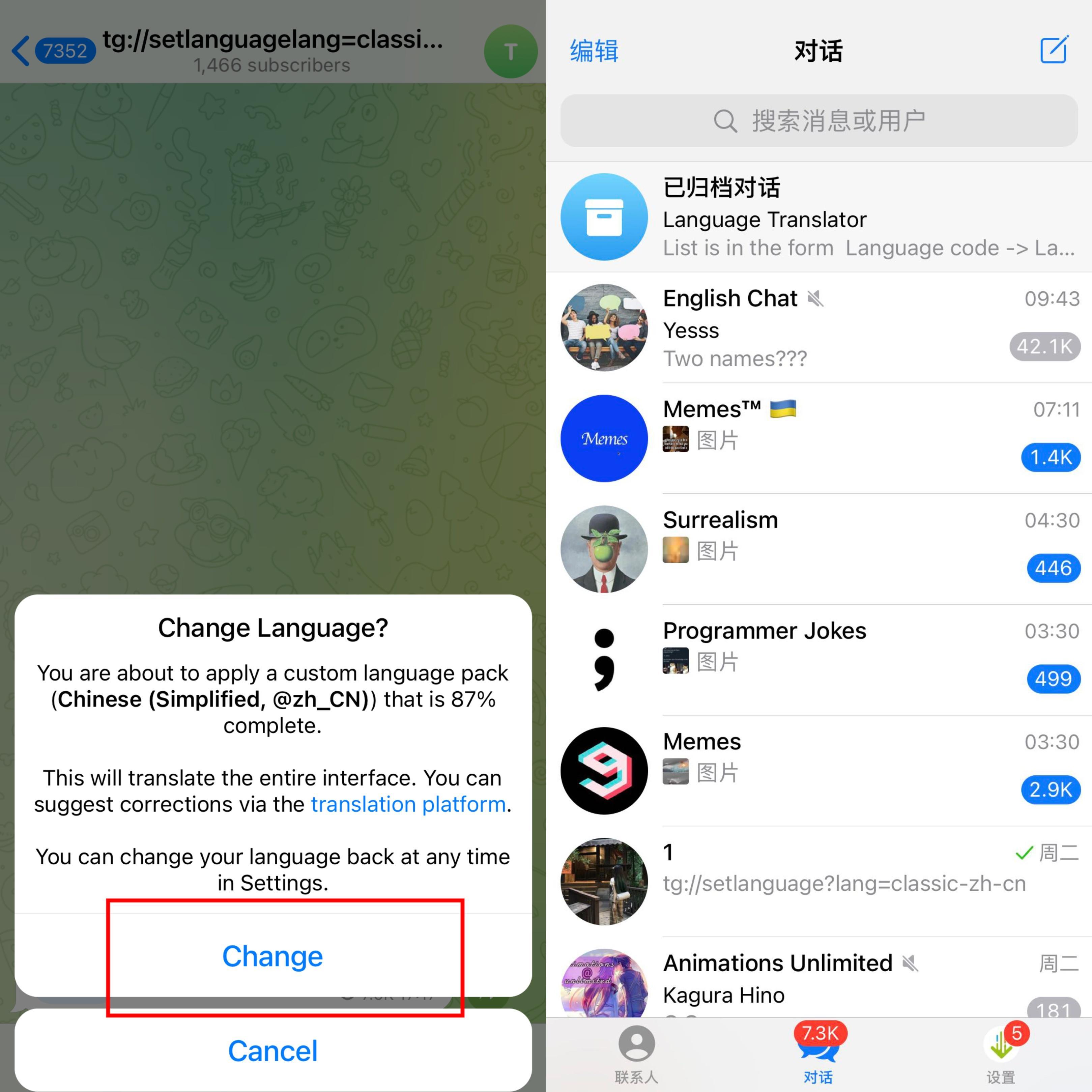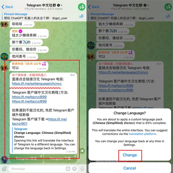 发送中文后在弹出来的窗口点击“https://t.me/setlanguage/zhcncc”该链接,再在弹出来的窗口点击“Change”