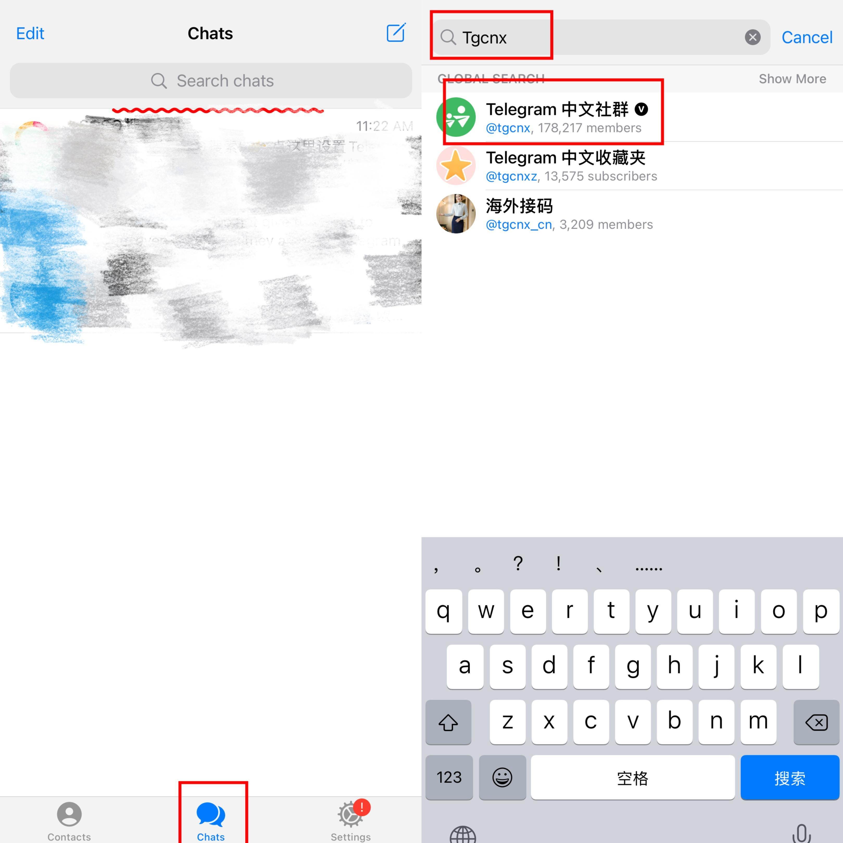 方法2:首先打开telegram的chats页面找到最上方的搜索栏,输入Tgcnx后点击“Telegram中文社群”