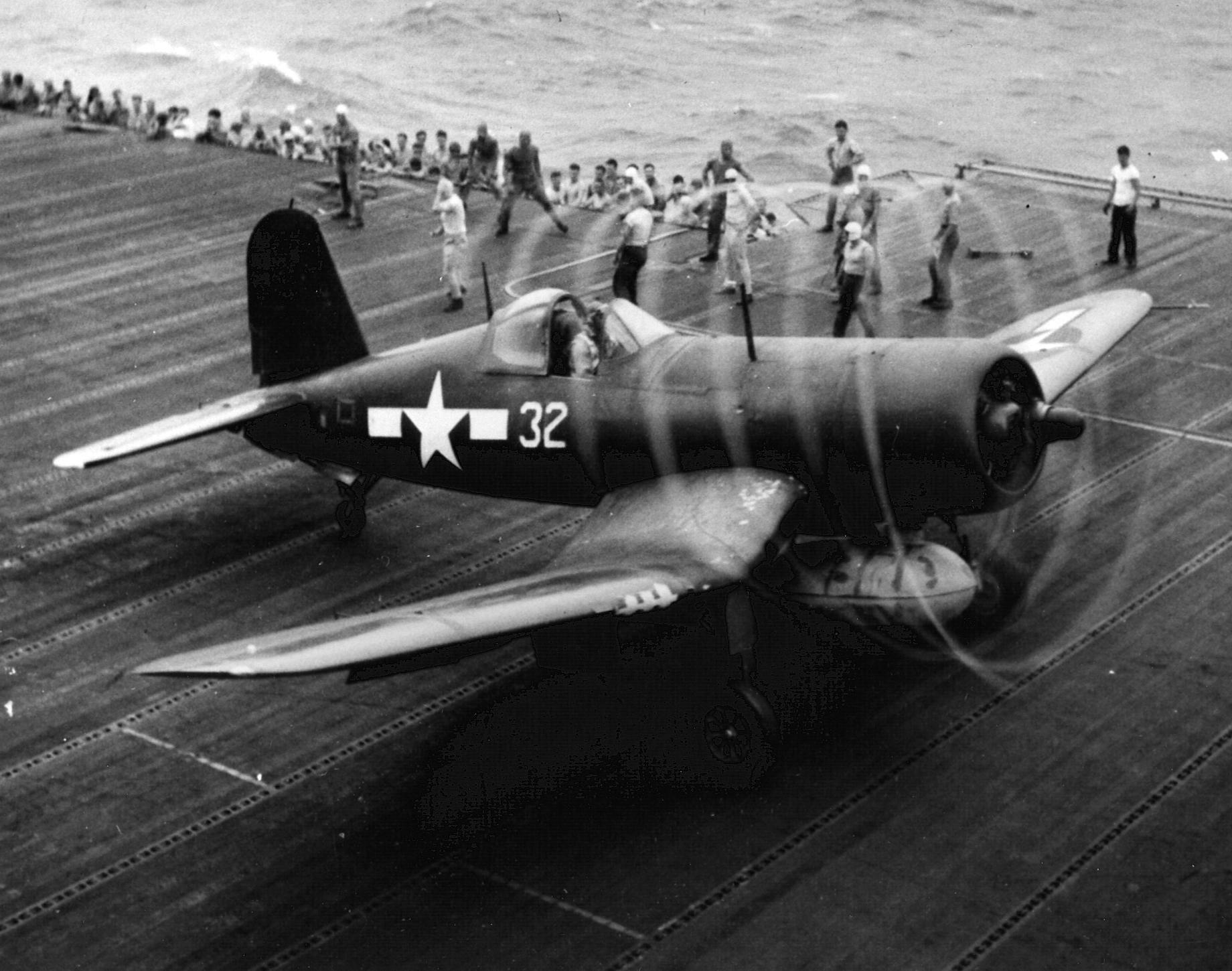 F4U海盗战斗机在战争后期出现在埃塞克斯级航空母舰上,它的主要性能指标包括:最大起飞载荷为6.654吨;引擎功率为2100轴马力;最大飞行速度为721公里/小时;6挺口径为12.7毫米的M2重机枪;2枚226公斤的炸弹;8枚口径为127毫米的高速机载火箭弹。日本海军称F4U海盗战斗机为“呼啸死神”,当飞机俯冲时,会发出一种能对日军造成死亡恐慌的声音。
