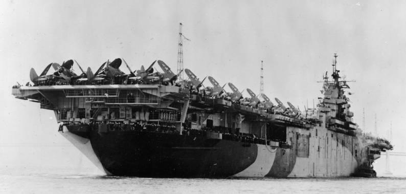 “埃塞克斯”号航空母舰(CV-9)于1943年5月投入使用,它是埃塞克斯级航空母舰的首舰。1943年10月,它成为第14特遣队的旗舰,参与对威克岛的攻击。1943年12月,它担任任务组50.3的旗舰。1944年2月,“埃塞克斯”号上的舰载机投下一枚500磅的炸弹,击沉了日军的“旧金山丸”号。1944年4月至1944年11月,“埃塞克斯”号上的航空大队总共进行了20000小时的空战。第二次世界大战期间,“埃塞克斯”号的主要损坏之一是由“神风特攻”空袭造成的,但它在3周内恢复了作战能力。“埃塞克斯”号在二战中共获得13颗“战斗之星”勋章以及“总统集体嘉奖”。