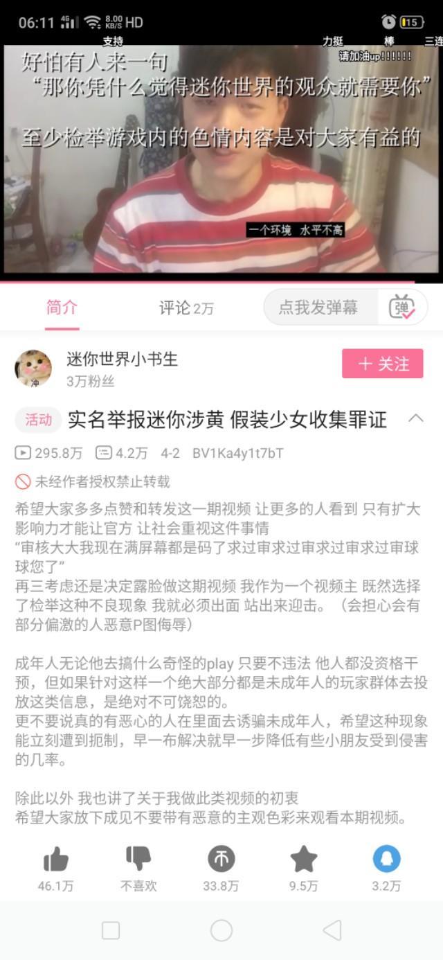 4月2日,b站up主“迷你世界小书生”发了一段视频“实名举报迷你涉黄”视频。