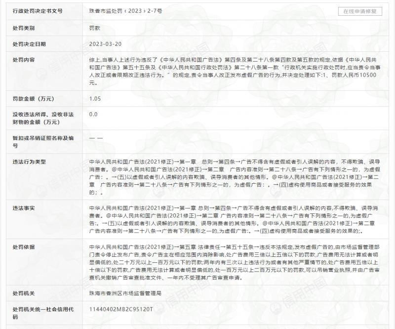 驱动中国2023年3月30日消息,根据信用中国相关信息显示,金稻美容仪关联公司珠海金稻电器有限公司因广告违法行为,被珠海市香洲区市场监督管理局罚款人民币10500元。