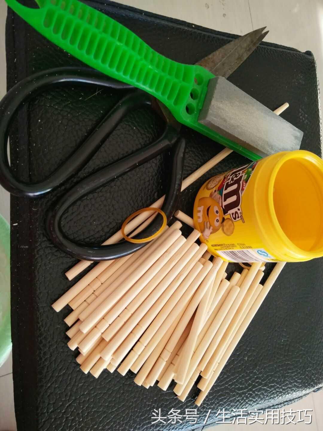 将筷子用剪刀剪至一定的长度,长度根据你想制作工艺品的大小决定。如图:
