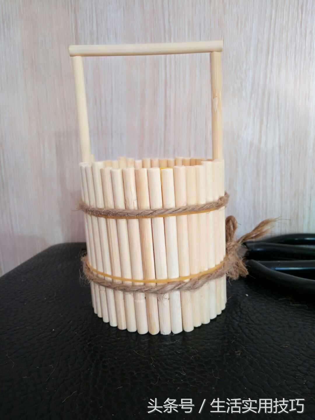 做法非常简单,经常做手工的亲们一看就明白。下面小编简单的讲一下步骤吧。首先用剪好的一次性筷子围着巧克力瓶拼一圈,用两根长点的筷子做木桶的把手,然后用麻绳和皮筋固定好,最上面一根筷子做桶的提手处。如图:
