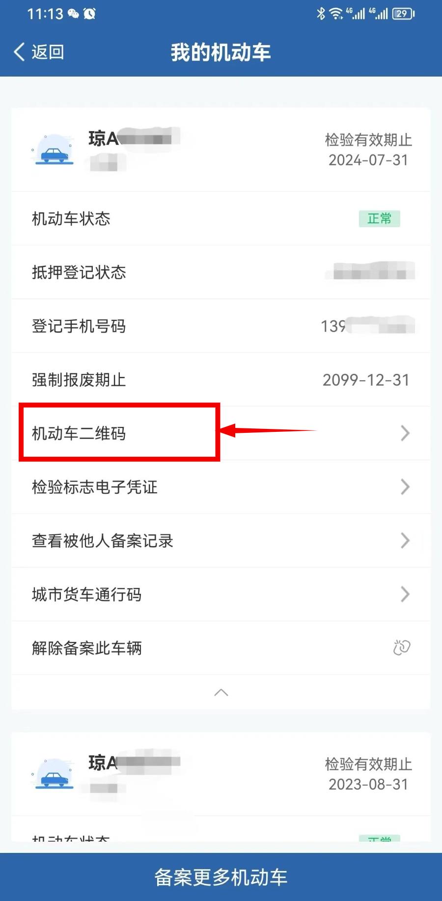 车主用户打开“交管12123”APP,点击首页左上角“机动车”→选择待备案的机动车,生成“机动车二维码”。
