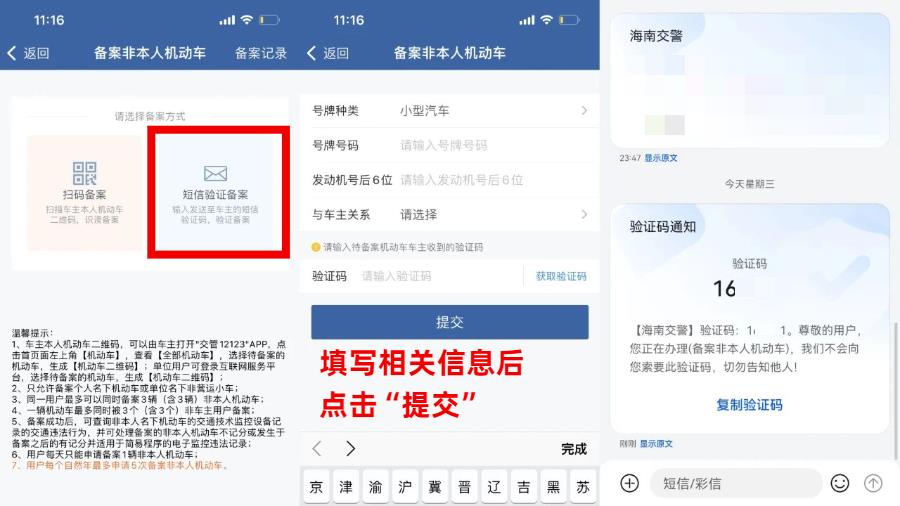 采用“短信验证备案”的,用户输入需要备案的非本人机动车的号牌种类、号牌号码、发动机号后六位等信息后。系统将发送短信验证码至车主手机号码(车主可以是非互联网平台注册用户),申请用户输入车主收到的短信验证码。