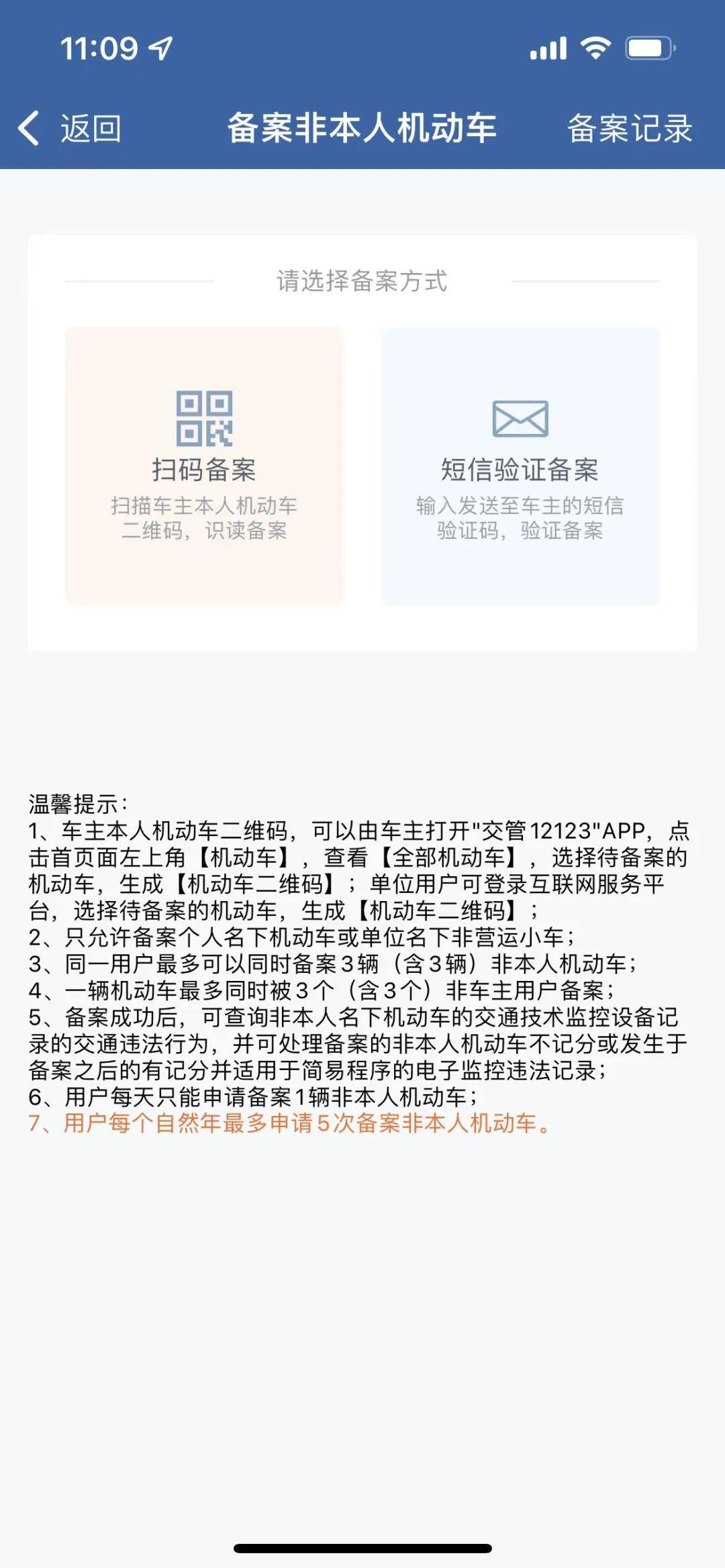登录“交管12123”APP后,在首页点击【更多】→进入“业务中心”点击【备案非本人机动车】,进入备案非本人机动车业务流程,用户可以选择“扫码备案”或“短信验证备案”两种方式备案非本人机动车。
