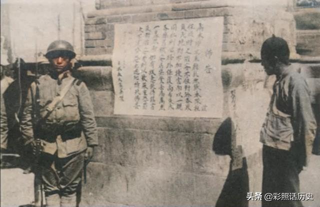 ▲上面这张老照片为在沈阳街头墙角边站着一名全副武装的日本宪兵,他旁边的布告写道,如果破坏治安,将给以“最严重的的惩罚”。