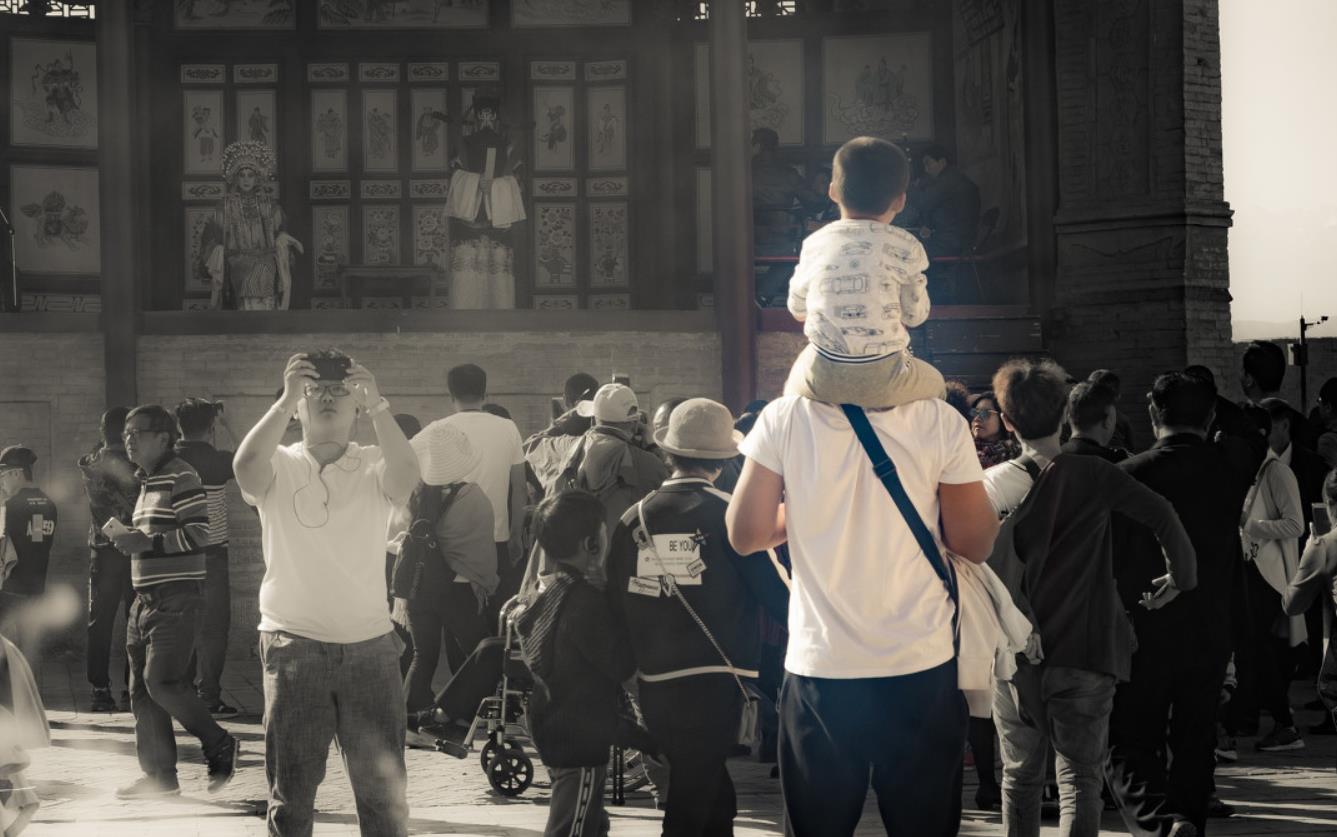 包很大,自然也不会有多轻巧,这位爸爸热得脱下了上身的短袖,光着膀子叼着烟,但抓着孩子的手却不曾有丝毫松懈。