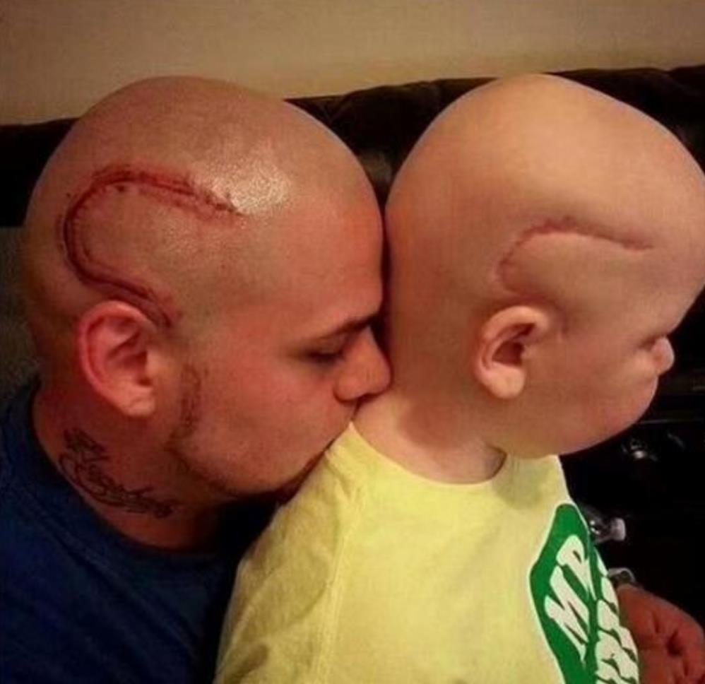 因为手术,孩子的头上留下了一道难看的伤疤,非常明显,而父亲为了避免孩子被嘲笑,干脆去纹了一个一模一样的伤疤回来,就是为了告诉孩子,你的伤疤和我没什么不同,这是很正常的,不需要因此而自卑。