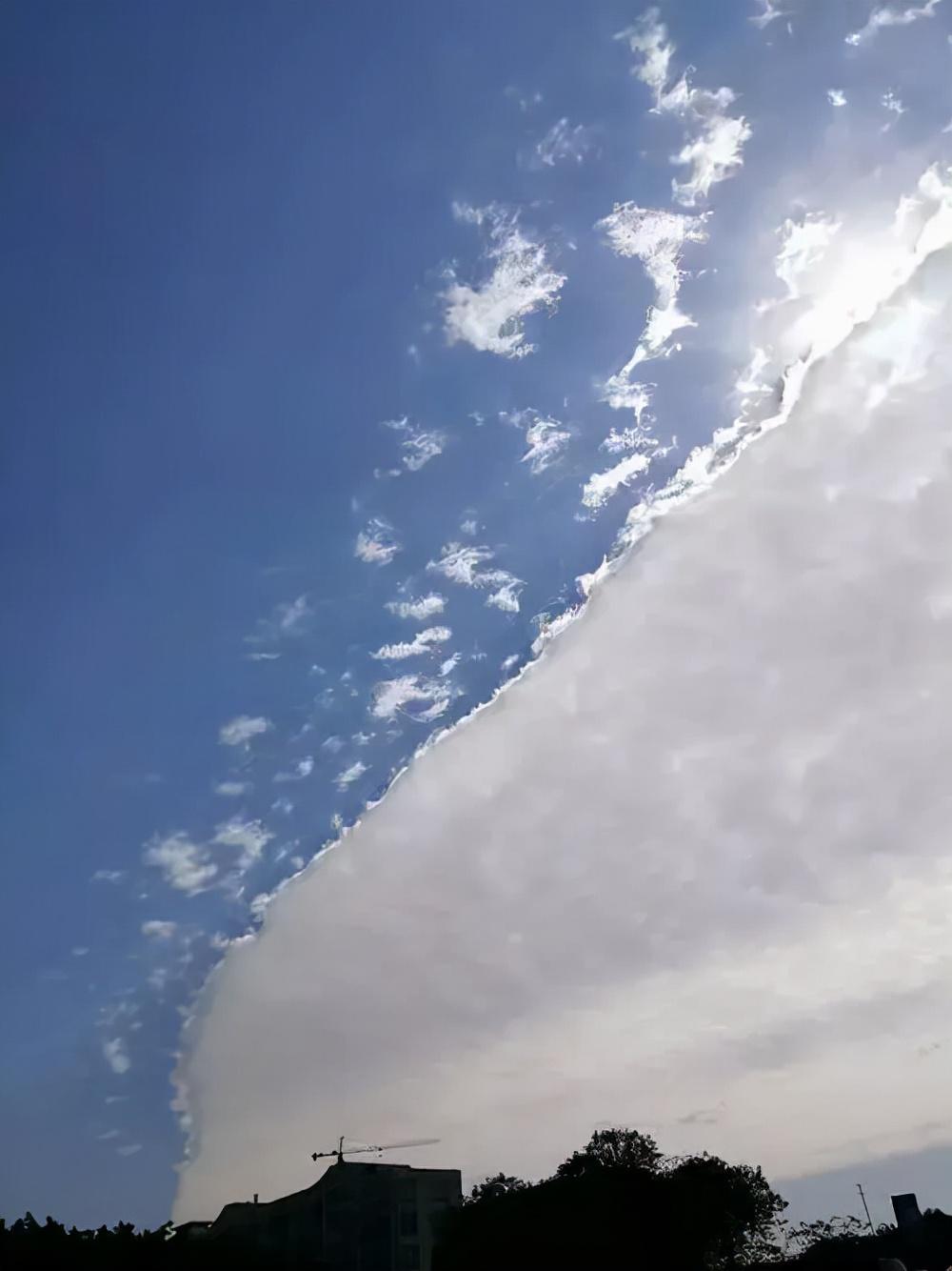 一般来说,从气象角度看,这是冷暖空气对峙产生的现象。干冷和暖湿的气流互相对冲,冷暖空气互相挤压,因为冷暖气团的温差很大,所以在交界的地方就有水汽凝结成小冰晶,甚至形成云,也就是我们看到的交界的“那根线”了。这根线,本质上是不同性质的气团的交界处,彼此冷热差异很明显之后,彼此的云团、气团就无法突破这层障碍、无法穿越壁垒到达对方的“阵营”里了。