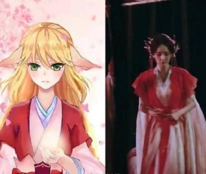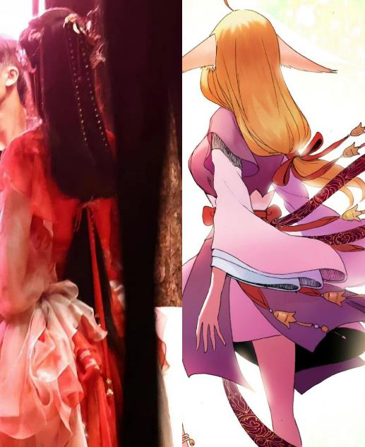 有细心的网友将杨幂的路透造型和动漫中的涂山红红做了对比,除了没有标志性的狐狸耳朵之外,无论是服装配色还是款式都极为相似。只是剧版涂山红红的造型大都采用轻纱材质,举手投足间尽显缥缈,还是很符合“妖仙姐姐”的人设。
