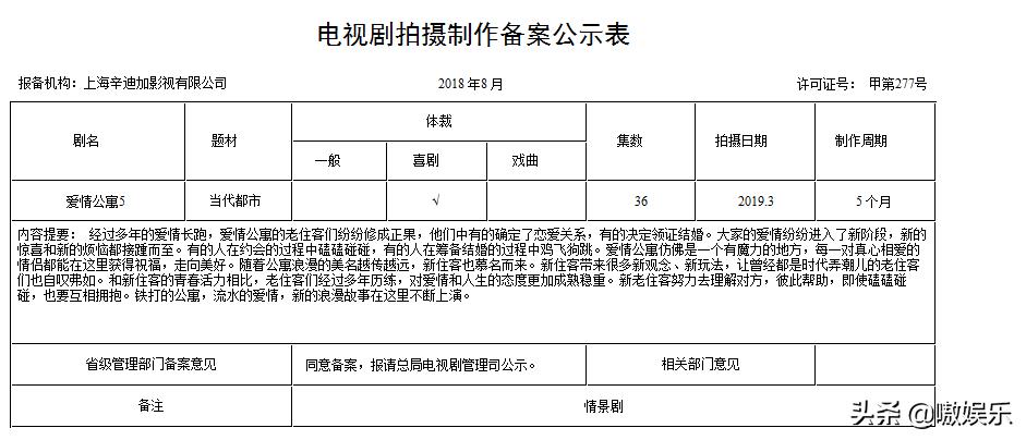而早在去年8月,全国电视剧拍摄制作备案公示的剧目共99部、3912集,《爱情公寓5》就在其中,目前已正式备案,预计于2019年3月开拍,共计36集。陈赫所说的:“今年要接连拍戏的缘故,会有很长一段时间集中精力呆在剧组”,很明显,就是3月份开拍爱情公寓第五季