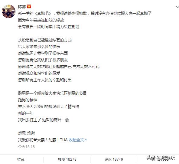 而陈赫离开《奔跑吧》的原因,他表示:“我很遗憾也很抱歉,暂时没有办法继续跟大家一起奔跑了因为今年要接连拍戏的缘故,会有很长一段时间集中精力呆在剧组”相信网友也猜到,要拍的或是大家期待已久的《爱情公寓5》