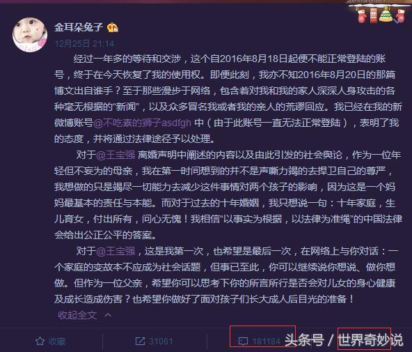 本微博一发,评论数累积到目前为止已经达到181184条,点赞数也达到了64999,而“金耳朵兔子”的粉丝总数目也达到了惊人的3802005,俨然是当红艺人的粉丝数,而且我们有理由相信,这还真的不是僵尸粉,大家已经都是为了看这个女人如果作妖而自动关注的。