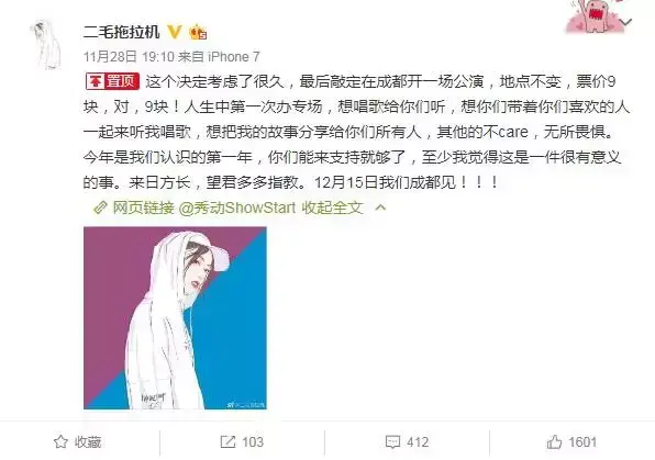 采访继续,我翻到她微博看到她居然办专场门票收9块,我就问她为什么